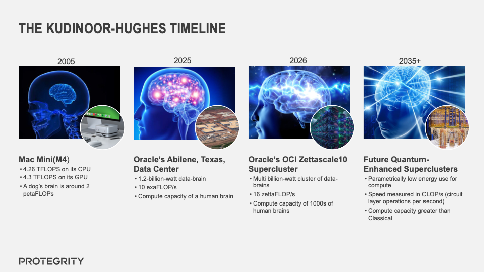 So, putting this all together, I asked my quantum group to put a timeline together, using FLOPs and CLOPs as measurement sticks for this ascendant intelligence. The point is to show how quickly compute is scaling, and why the mania is only accelerating.