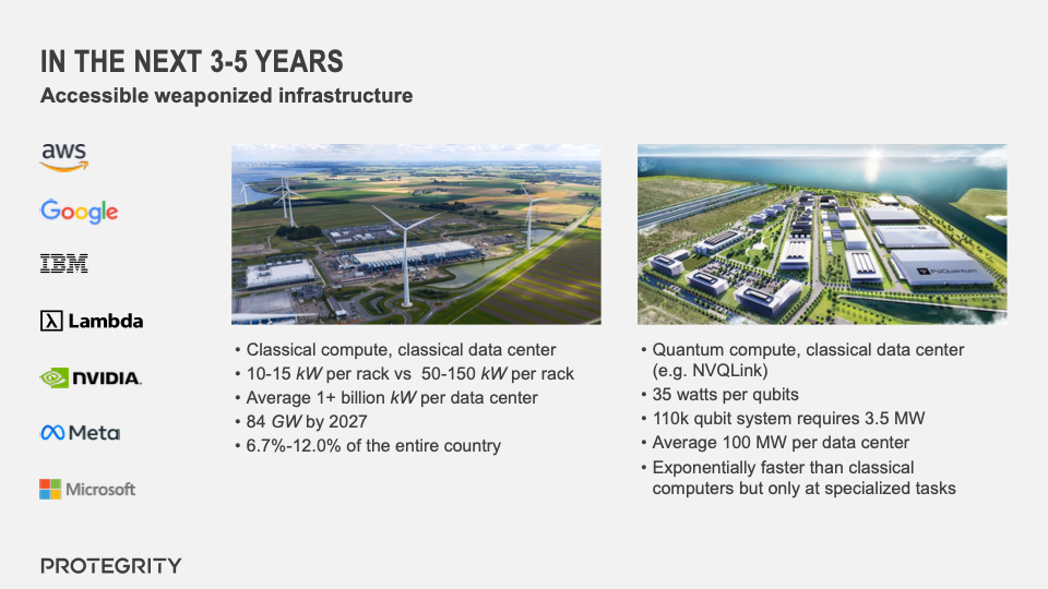 And what’s also notable about this is that the same fortunes building AI data centers are the same fortunes building quantum data centers. Quantum systems are potentially 13,000x more efficient than classical data-brain data centers. In fact, the two need to come together: Classic holding onto data, from which quantum can process. This coalescence is no better represented by a recent announcement about Nvidia’s NVQLink, which binds the two, acting as what Nvidia’s CEO Jensen Huang called “the Rosetta Stone of the quantum era,” enabling every future Nvidia GPU supercomputer to operate as a hybrid quantum system.